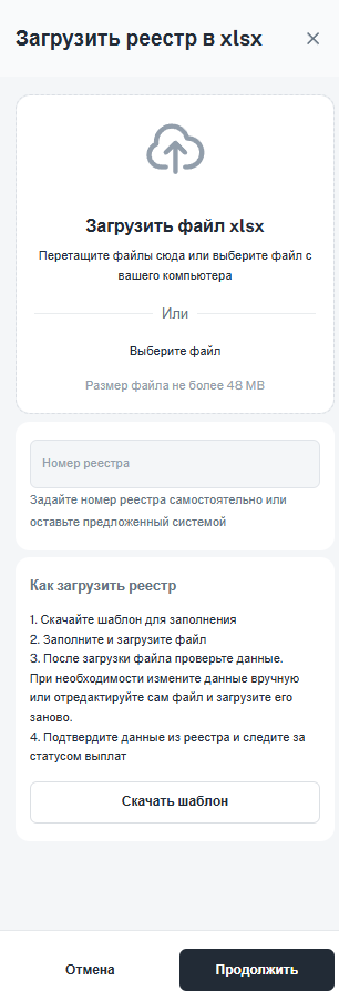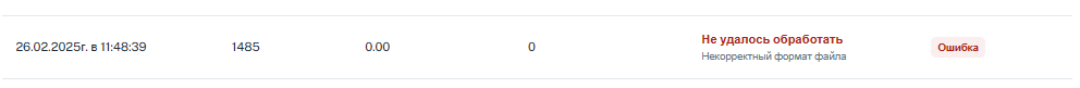 Если формат файла некорректный, система отобразит сообщение о том, что загрузка реестра не удалась. Проверьте формат и загрузите корректный файл повторно.