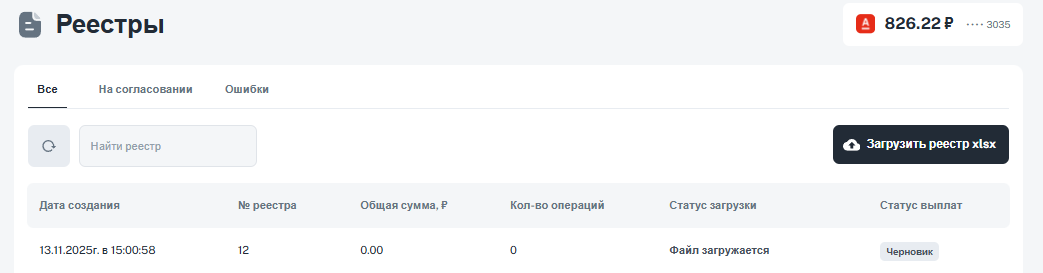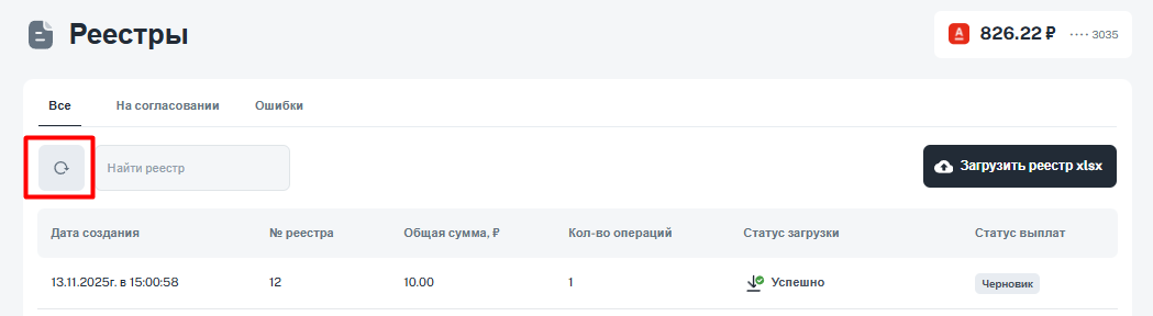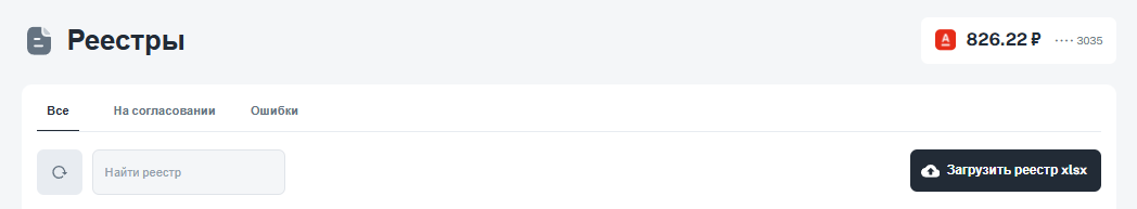 Задайте номер реестра и нажмите «Обработать реестр». Дождитесь, когда система загрузит и обработает файл вашего реестра. Обновить статус реестра вы можете по круговой стрелке в шапке таблицы.