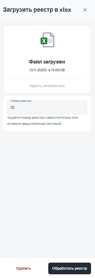 - № реестра: номер, указанный при загрузке файла реестра. Нумерация автоматическая, или вы можете указать номер самостоятельно.
