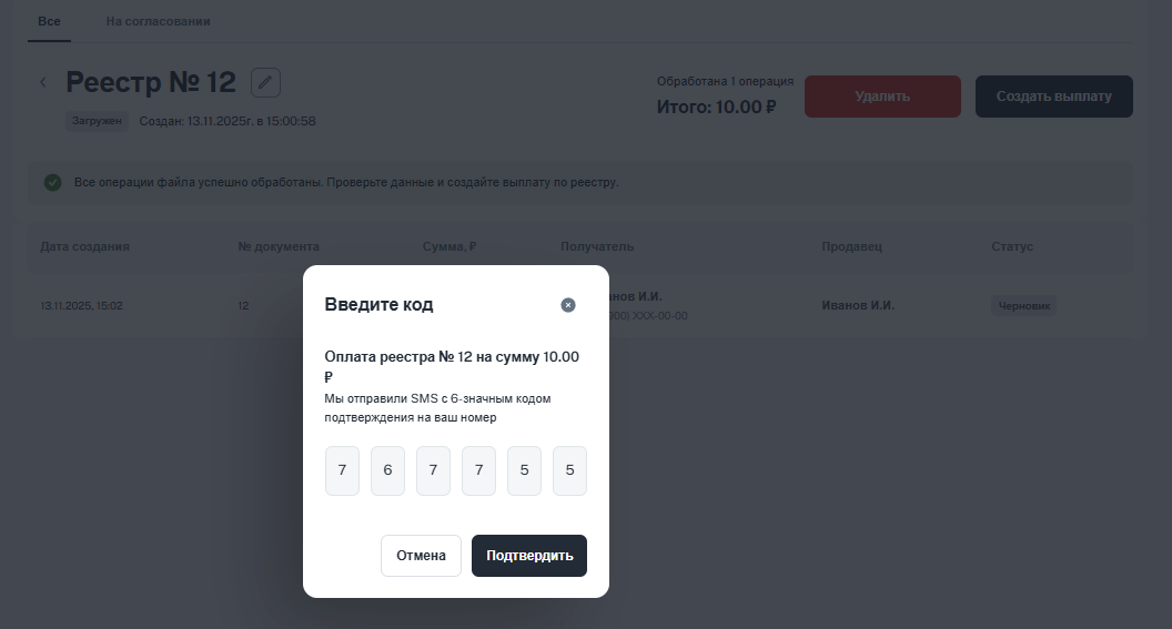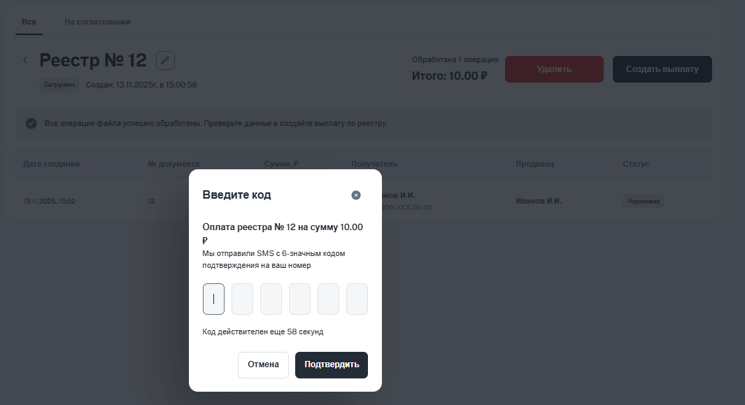 Введите код из смс-сообщения, отправленного на ваш номер телефона, для создания выплаты и нажмите кнопку «Подтвердить».
