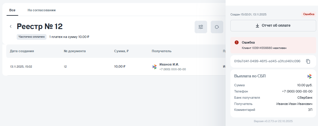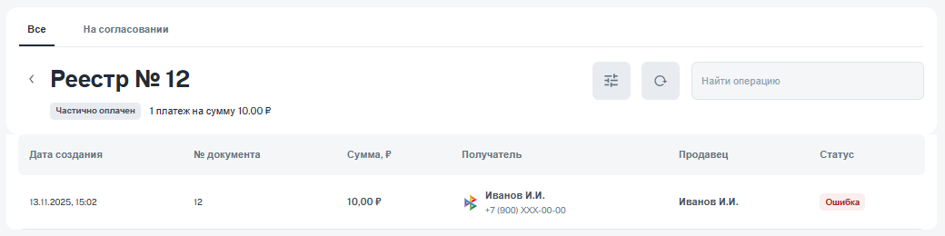 Как только все операции в реестре обработаются, статус изменится на «Оплачен». В случае наличия ошибок при создании выплат реестр будет оплачен частично. Вы можете проверить ошибочные операции и повторить их на те же или другие реквизиты.