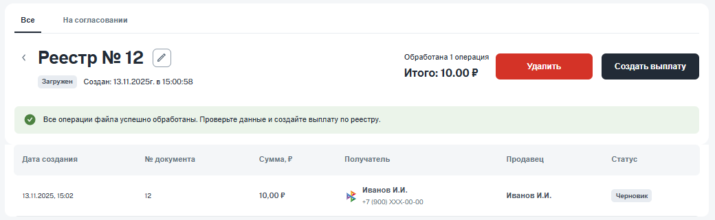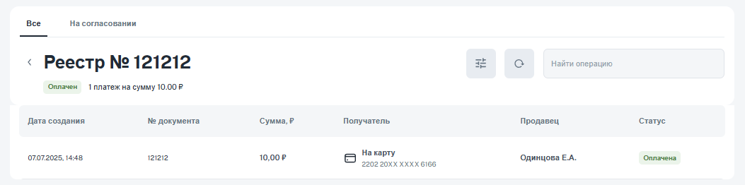 Нажмите на строчку с успешно загруженным реестром, чтобы посмотреть подробности по нему: количество и сумму обработанных операций реестра, реквизиты и ФИО получателей платежей.