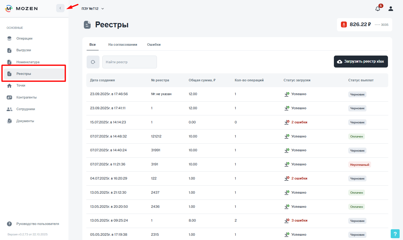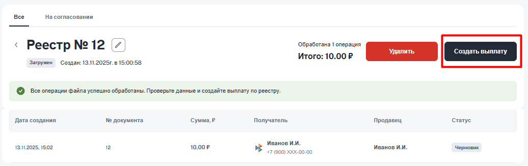- Статус выплат: текущий статус всех выплат, включенных в реестр.
