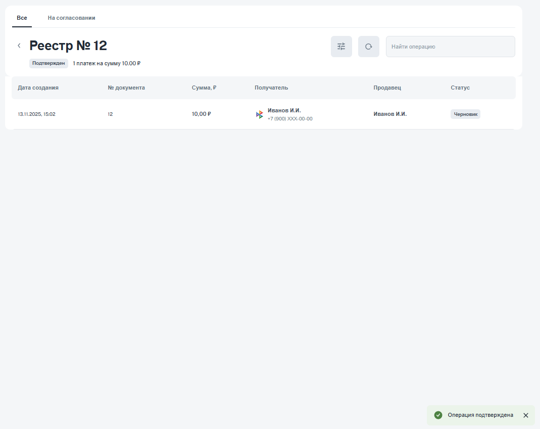Если подтверждение прошло успешно, в правом нижнем углу экрана появится уведомление «Операция подтверждена», а статус реестра сменится на «Подтвержден».
